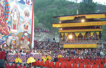ブータン最大の祭りである“パロツェチュ”。この時期になるとブータンの国中から大勢の国民たちがパロに集まり、普段は静かなパロの街は大変な賑わいを見せます。トンドルと呼ばれる大きな仏画が壁に掲げられるパロツェチュの最終日にこの会場を訪れ、ブータンの人たちと一緒に祭りを体験します。