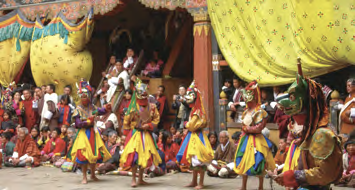 ツェチュでは祭りの会場で僧侶が仮面をかぶって、見事な演舞を披露します。宗教儀式と祭りが一体となって行われる一大イベントです。