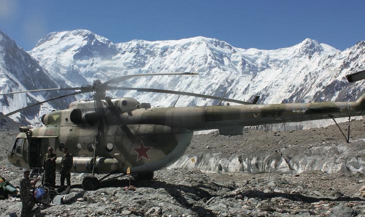 氷河のキャンプ地までは、大型ヘリコプターを利用して入下山します。