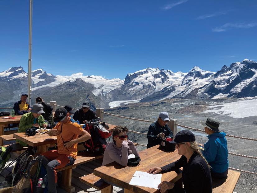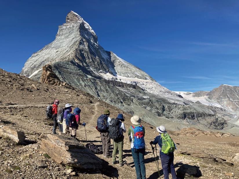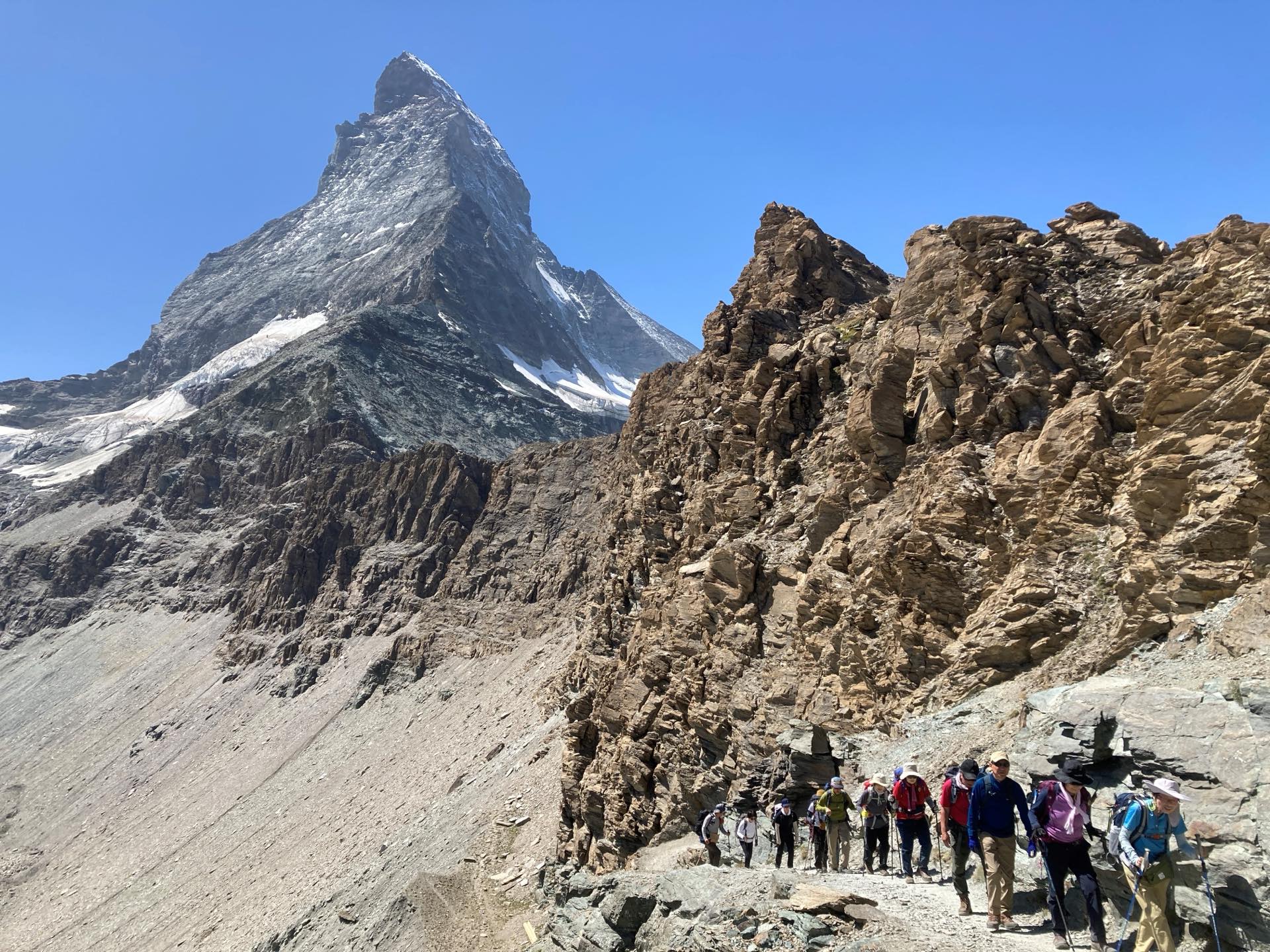 美しい山々の景色を眺めながら、グリュッチアルプ(1,486m)まで下りのハイキング(徒歩約3.5時間)。ロープウェイと列車を乗り継ぎツェルマット(1,620m)へ(約3時間、乗り換え4回)。