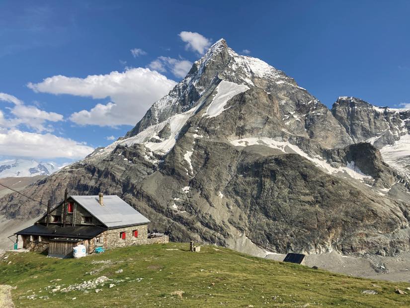 ゴンドラで シュワルツゼー(2,583m)へ。マッターホルンの北壁を左手に見上げながら歩きます。氷河によって形成されたモレーン沿いの道をゆっくりと登りシェーンビール小屋(2,694m)へ(徒歩約4.5時間)。見慣れた姿とはまったく違うどっしりとした山容のマッターホルンが眼前に迫ります。
