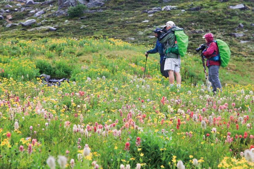 エスプラナーデ山脈は、東にロッキー山脈、西にセルカーク山脈に挟まれた山域であり、見渡す限りの絶景が広がる尾根歩きを楽しませてくれます。麓から山小屋までは登山道がないため、往復のアクセスはヘリコプターを利用します。そのため、エスプラナーデ山脈では山小屋の滞在者以外に他のハイカーに出会うことはありません。食事は同行するカナダ人シェフが腕によりをかけて作り、山歩きはツアーリーダーとガイドの2名体制でご案内。さらに、ひとつの山小屋には12名しか泊まれず、各小屋もグループだけで完全貸し切りとなる、最高に贅沢な山旅です。時にはお花畑の中を、また、ある時は岩稜帯を歩きながら、3泊4日の山小屋縦走を楽しみます。