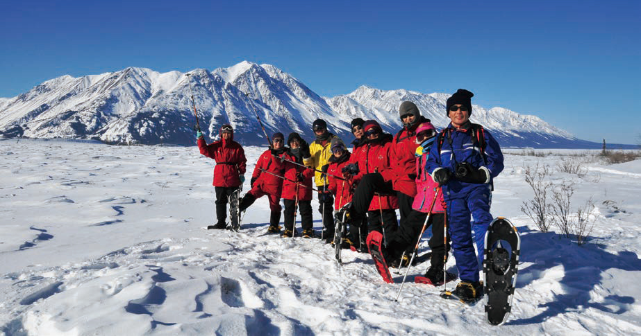クルアニ湖周辺や国立公園、ゴールドラッシュの跡地などへのスノーシューハイキングへ出かけます。凍った湖の上や高低差のある森の中など、コースはいろいろあります。
