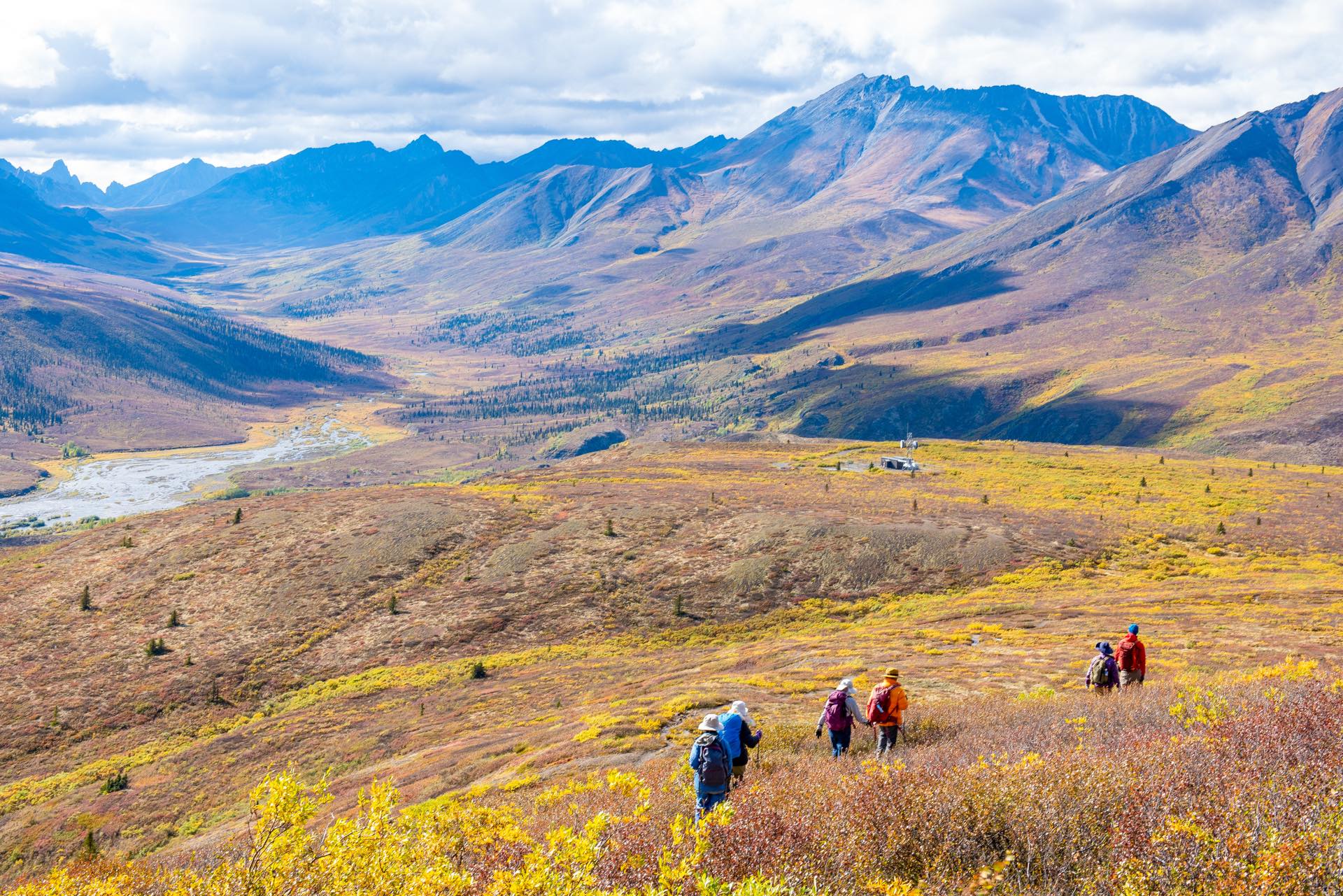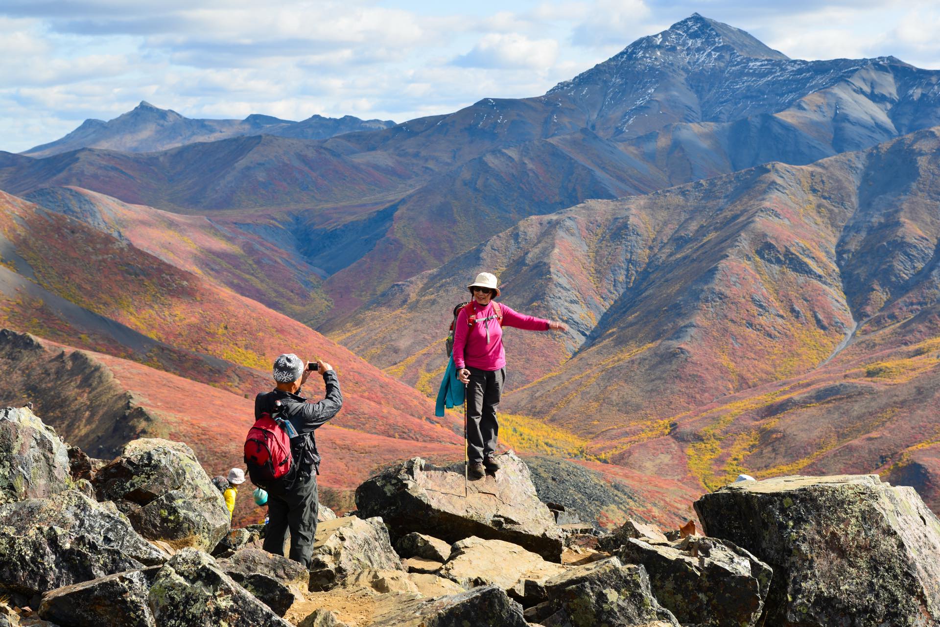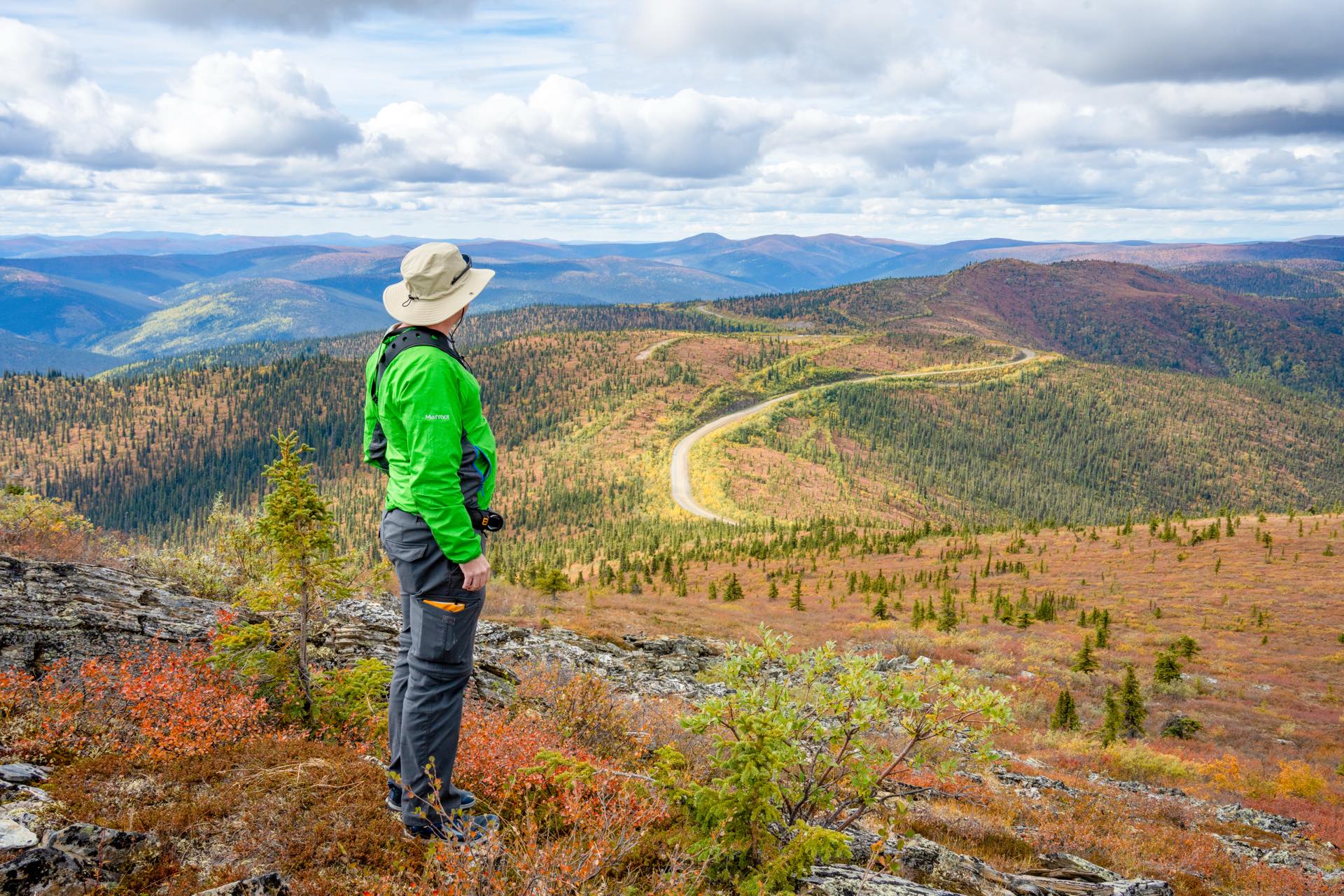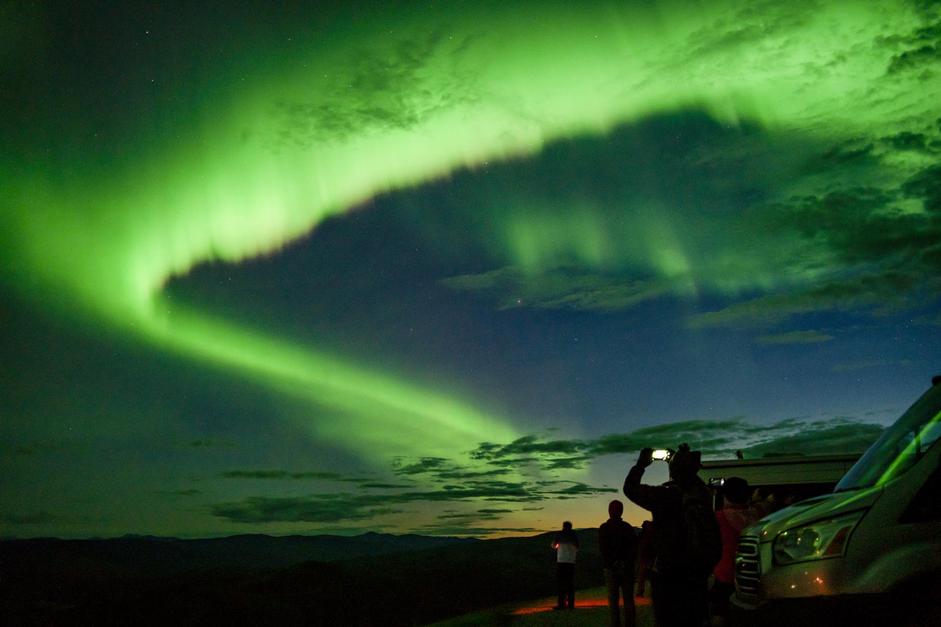 専用車とフェリーでユーコン川を渡り、赤や黄色に染まる山を見下ろすトップオブザワールド・ハイウェイをドライブ。景観の素晴らしい場所に車を止め、道なき道を尾根まで登ります。展望が素晴らしいのはもちろん、ブルーベリーを摘みながら歩く、ユーコンらしいハイキングが楽しめます(徒歩約2時間)。夜間はオーロラ鑑賞にドーソンシティーの郊外へ出かけます。