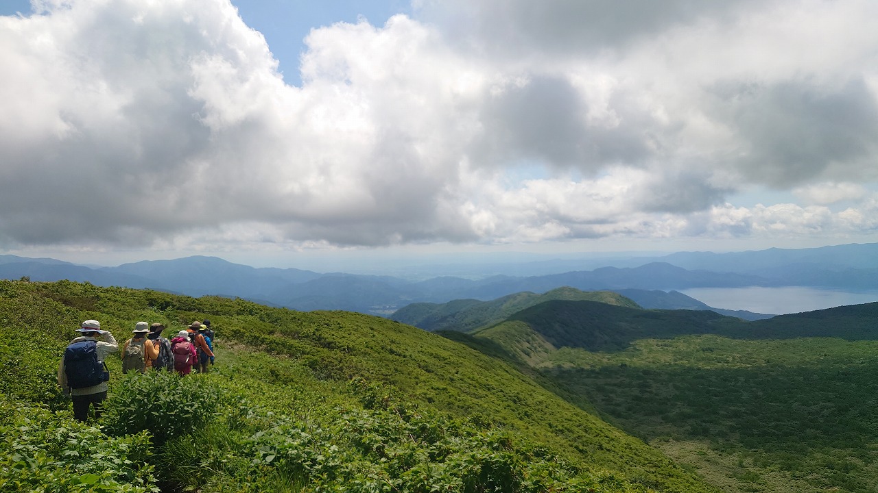 秋田駒ヶ岳から乳頭山にかけての縦走路は、シャクナゲやシラネアオイなどの花が咲き誇り、たおやかな山々をつなぐ登山道からは山麓に広がるブナ林の展望が広がり、登山者が少ないためたいへん静かな山登りを楽しむことができます。