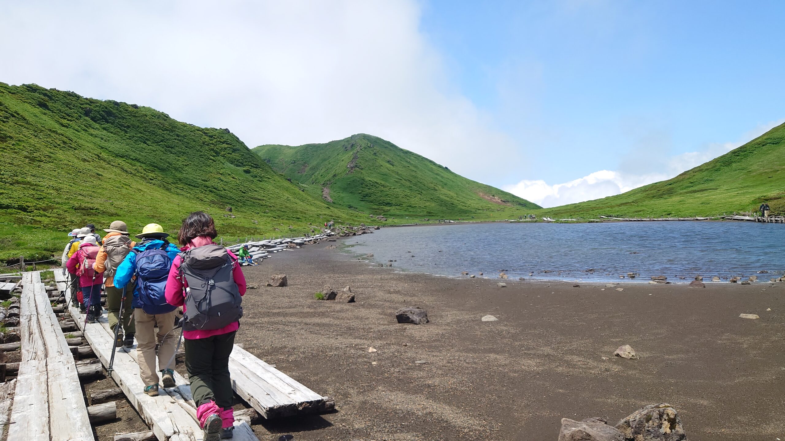 秋田駒ヶ岳・阿弥陀池のほとりの木道を歩く