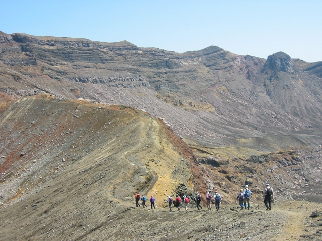 【3日目】南阿蘇・阿蘇山上広場へ。火山地帯の荒涼とした砂千里ルートを登って中岳へ。阿蘇山最高峰・高岳に登頂します。山頂一帯はミヤマキリシマの群生地です。阿蘇外輪山と大カルデラ、北側に九重連山の展望の中、仙酔峡に下山します。