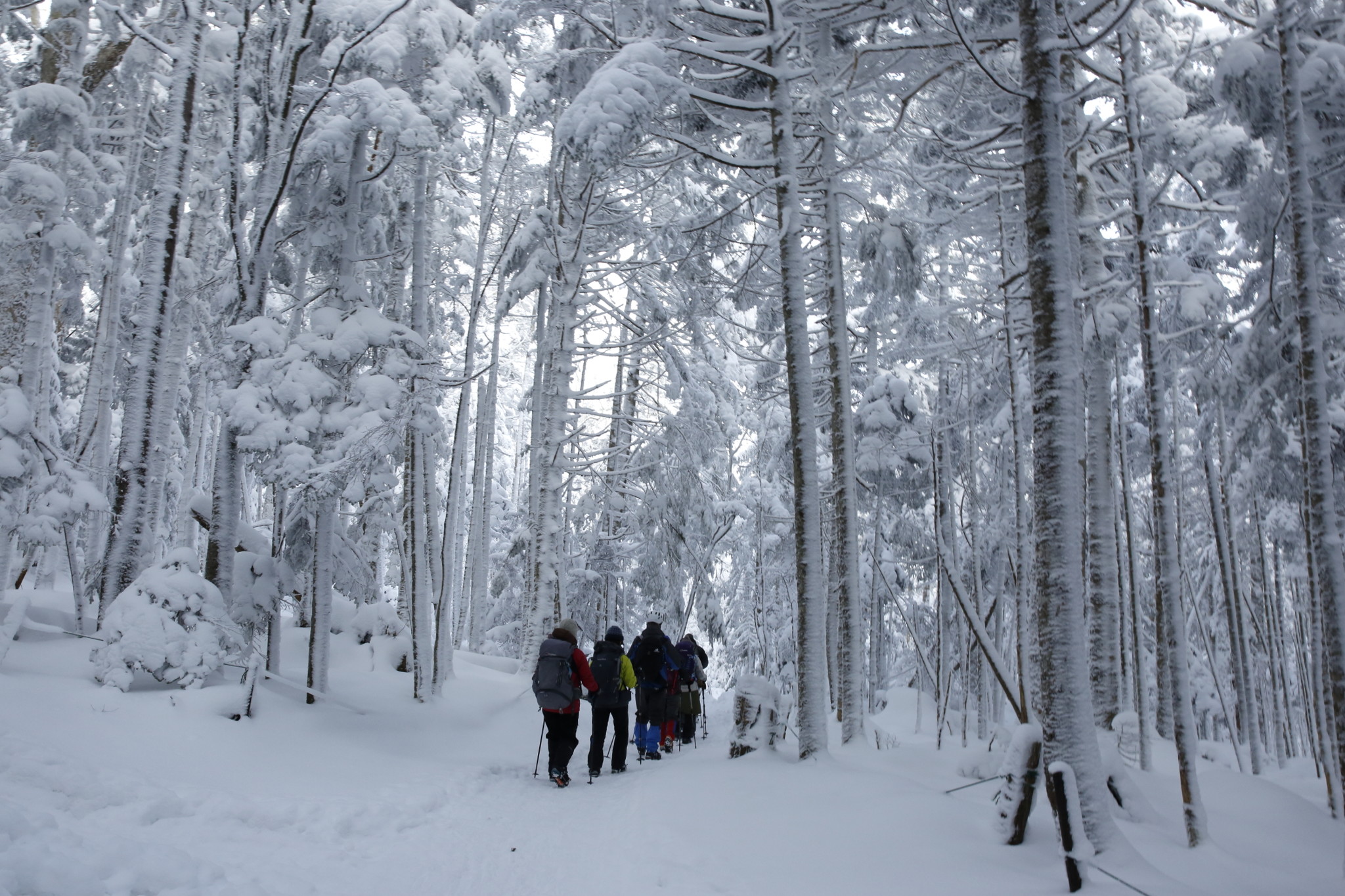 白い雪、誰も歩いていない雪原、吹雪、張りつめた空気、凍りついた樹木、木々についたエビのしっぽ、樹氷と青空、深雪など。雪山は普段の生活とまったく違う世界となります。