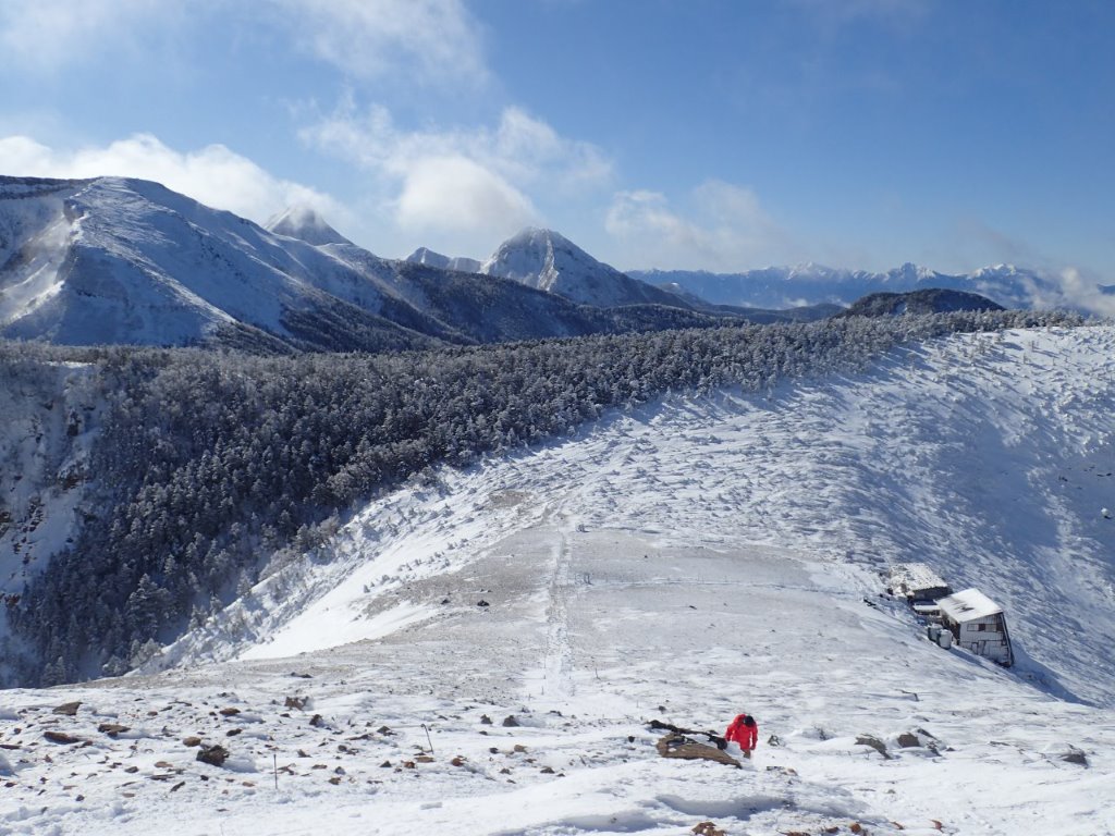 箕冠山から先は樹林限界を超えた強風地帯に入りますので防寒チェックを入念にします。