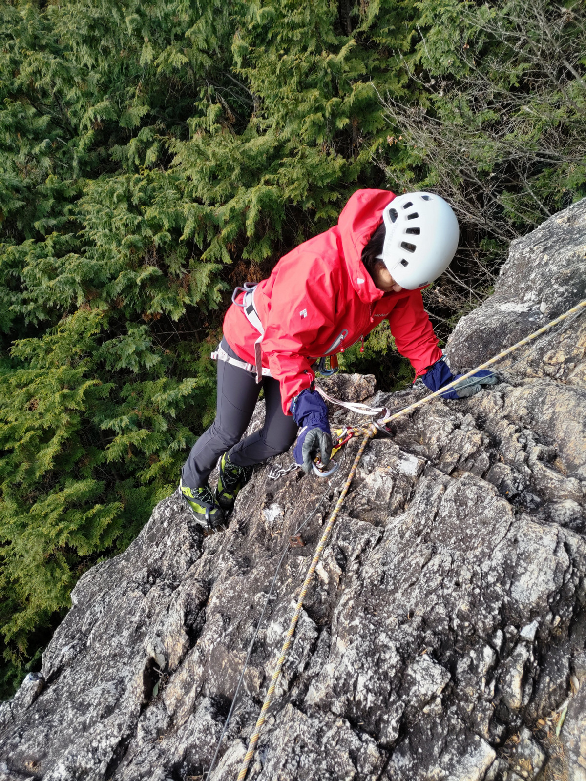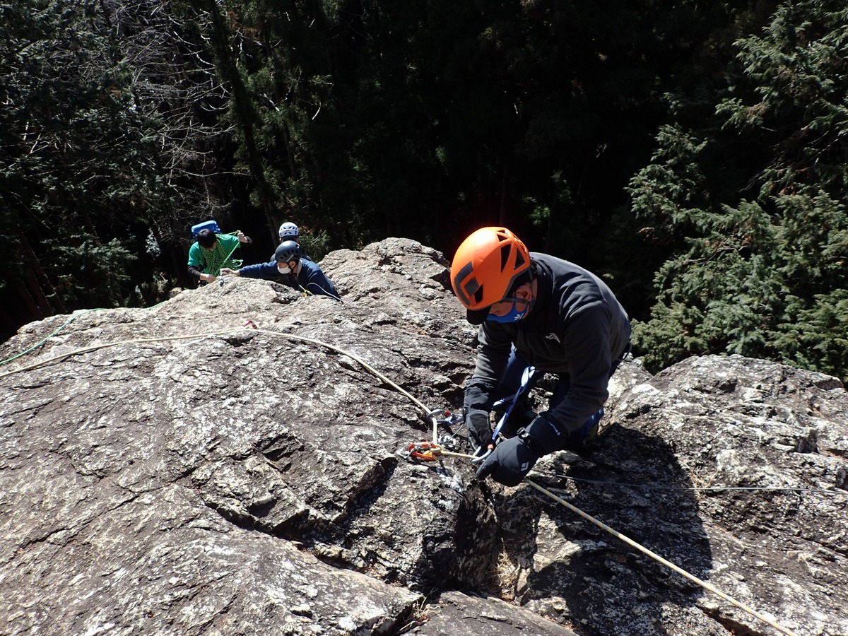 日和田山の男岩・女岩の岩場は、古くからの岩登りのゲレンデです。岩場でのアイゼン歩行とピッケルの使い方、三点支持、自己ビレー、フィックスロープの行動等を中心にトレーニングします。終盤は実際のガイド登山を想定して、ショートロープ(ガイドにロープで確保されながらの歩行)で行動します。
