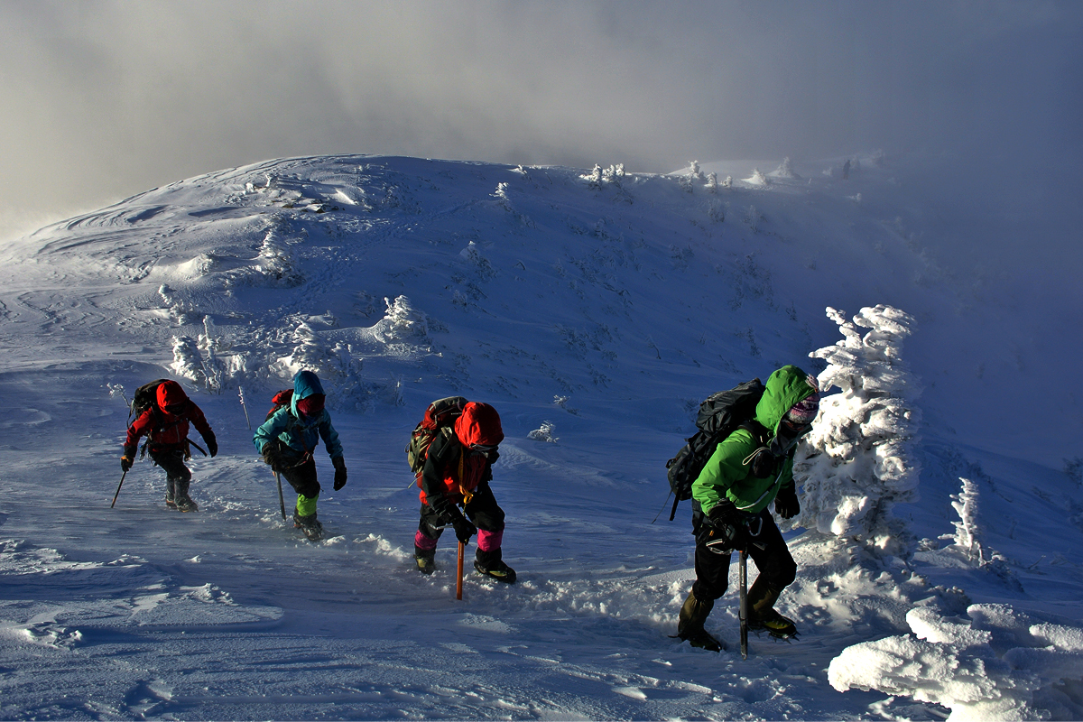 雪の山にもレベルがあり、時期と山により、準備する装備は変わります。あたりまえのことですが、足を置く場所はすべて雪(とければ水になる)であり、風が強ければ、体感温度が下がります。融けた雪は水となり、風に当たると水は瞬く間に凍ります。持ち物に不備があることは危険にもつながりますので、しっかり準備を整えて雪山に挑戦してください。