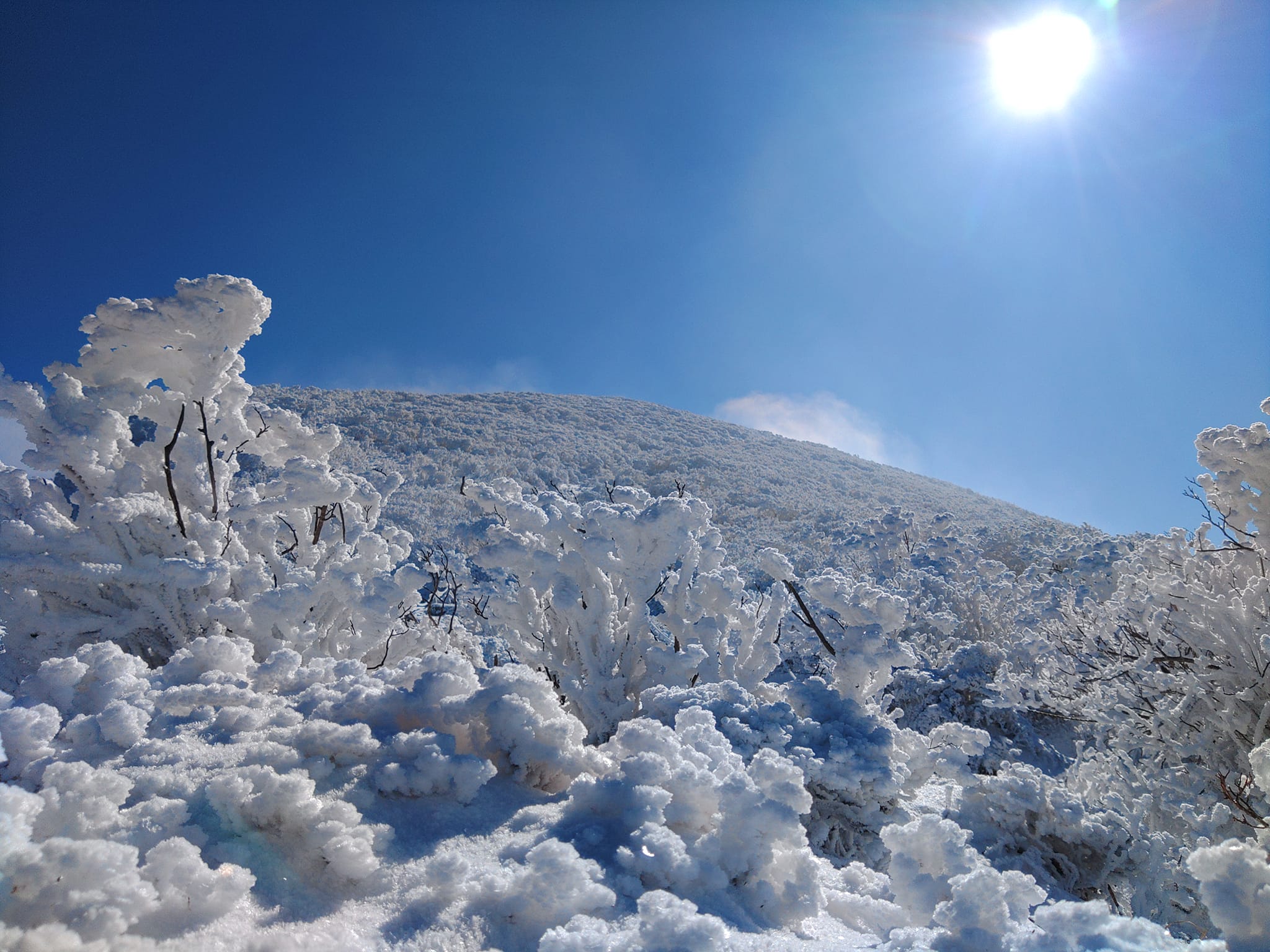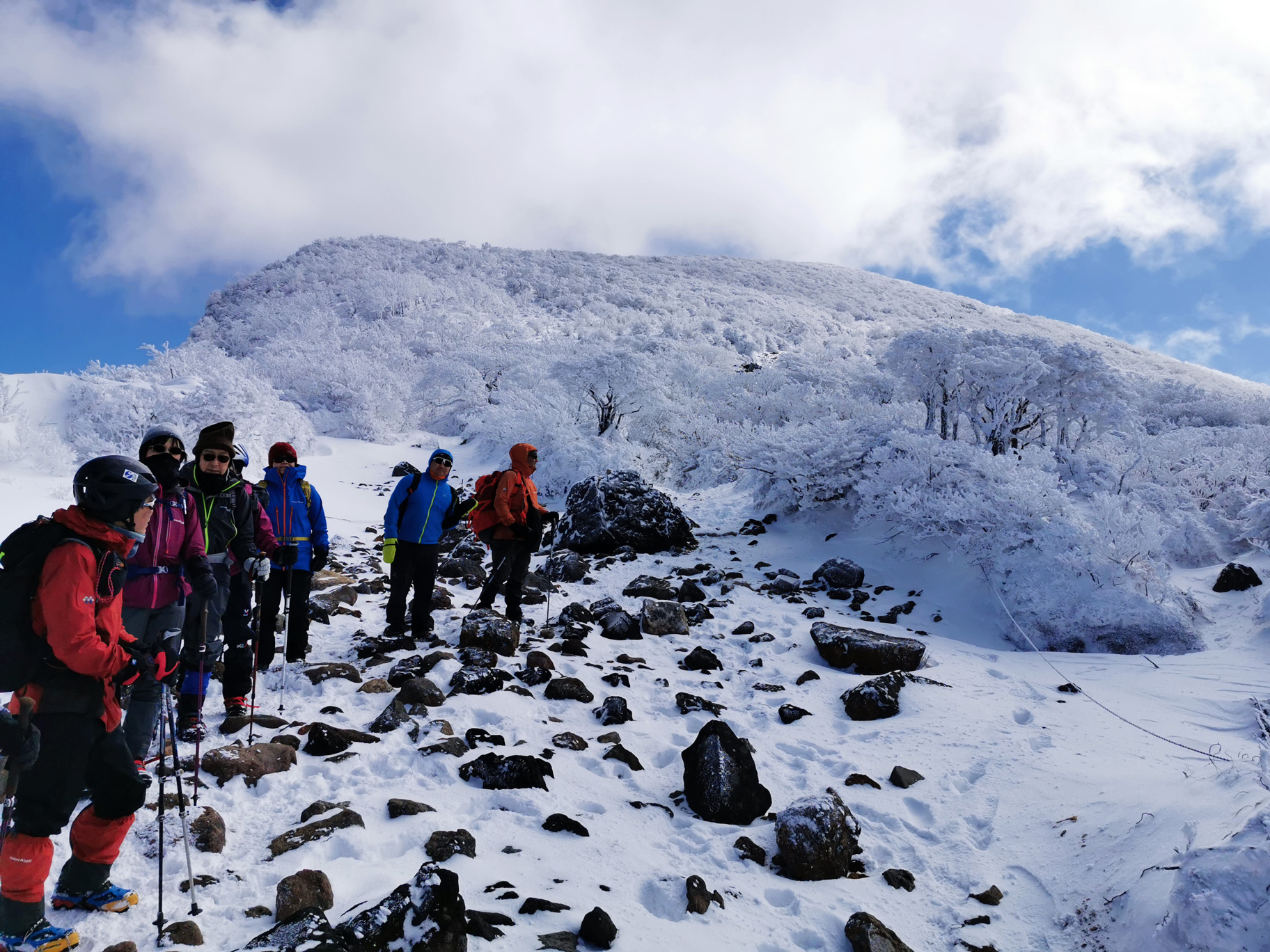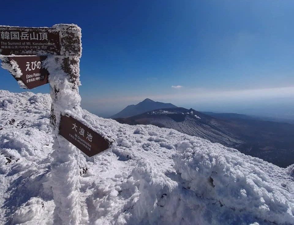 【2日目】霧島連山最高峰の韓国岳へ。山頂一帯は雪の世界です。条件が合えば霧氷もあり、天気が良ければ錦江湾(鹿児島湾)と桜島の展望が広がります。