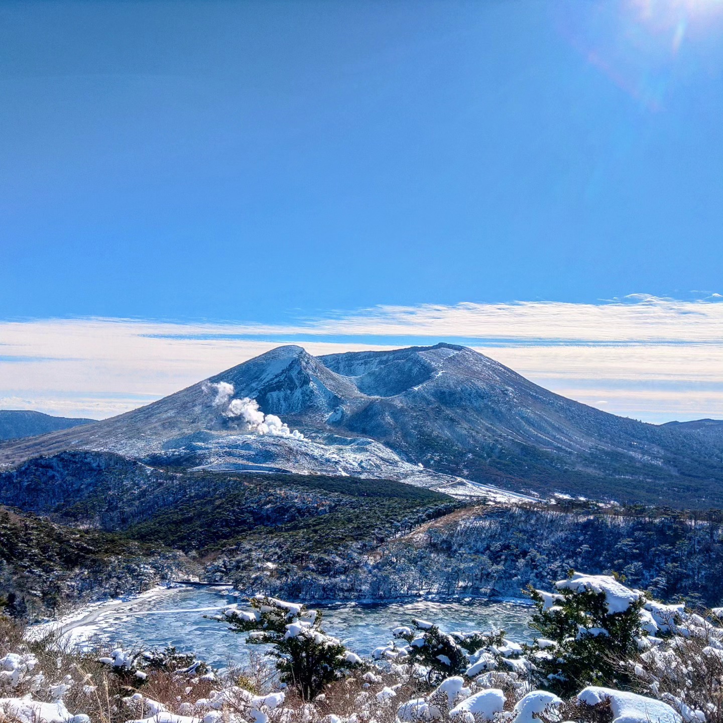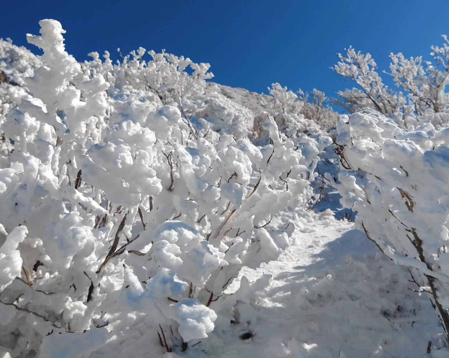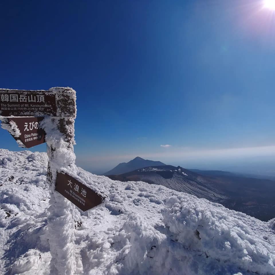 【2日目】霧島連山最高峰の韓国岳へ。山頂一帯は雪の世界です。条件が合えば霧氷もあり、天気が良ければ錦江湾(鹿児島湾)と桜島の展望が広がります。