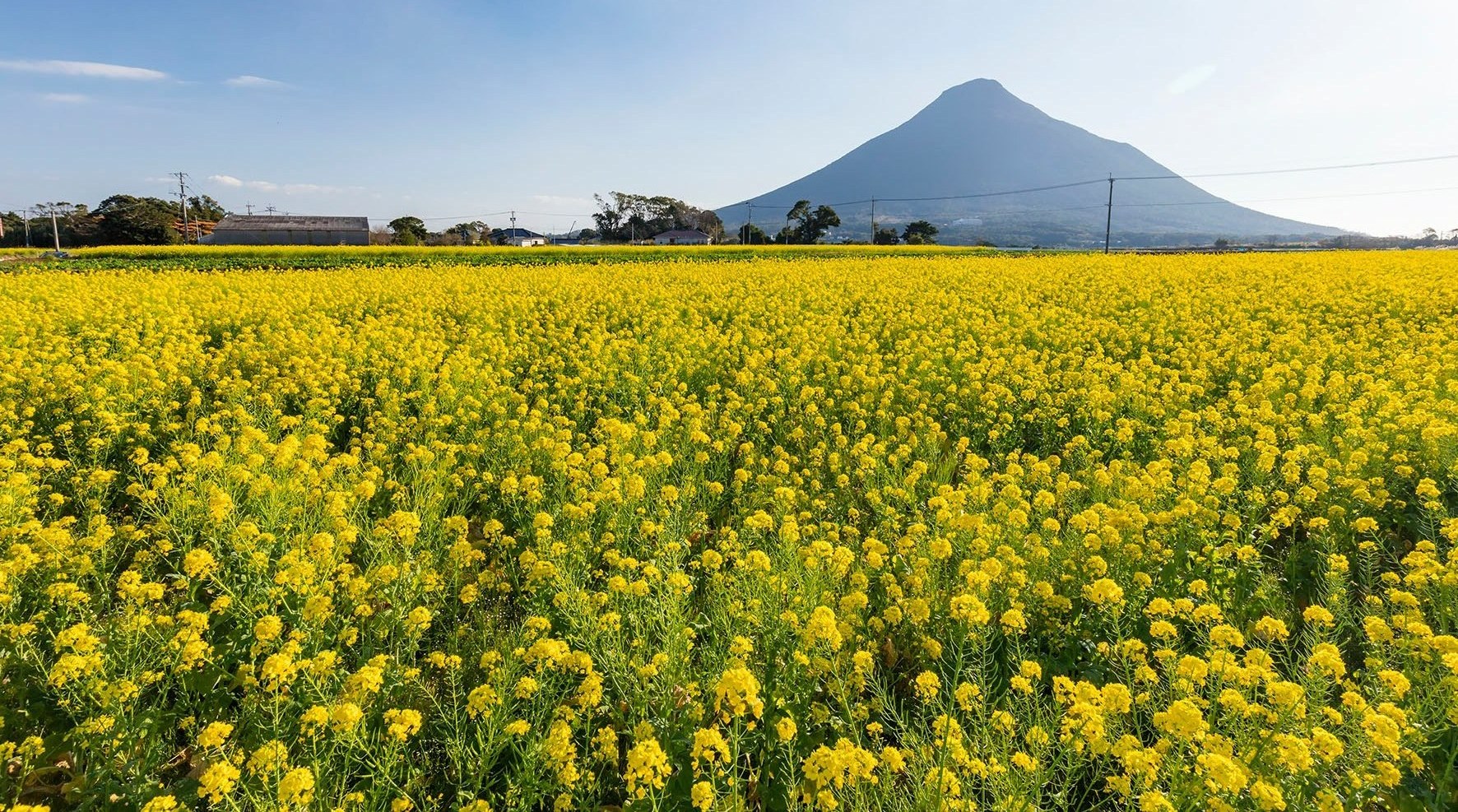 霧島山の雪山登山、開聞岳山麓では一面の菜の花畑など、雪と花の両方が楽しめます。