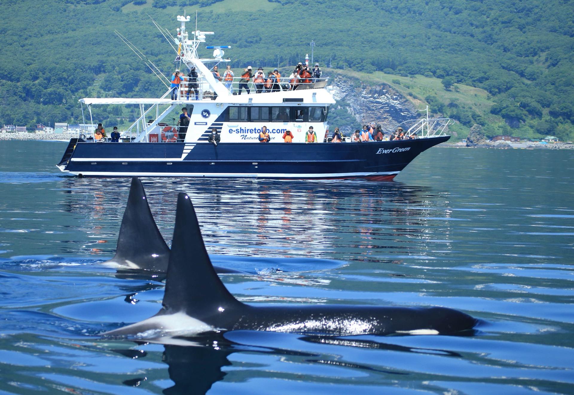 夏、栄養豊富な羅臼の海に、マッコウクジラやイルカ、シャチ、ミズナギドリの大群などがやってきます。会えるかどうかは運もありますが、知床連山や国後島の壮大な景観を楽しみながら、クジラ類や鳥類を探すクルージングに出かけましょう。
