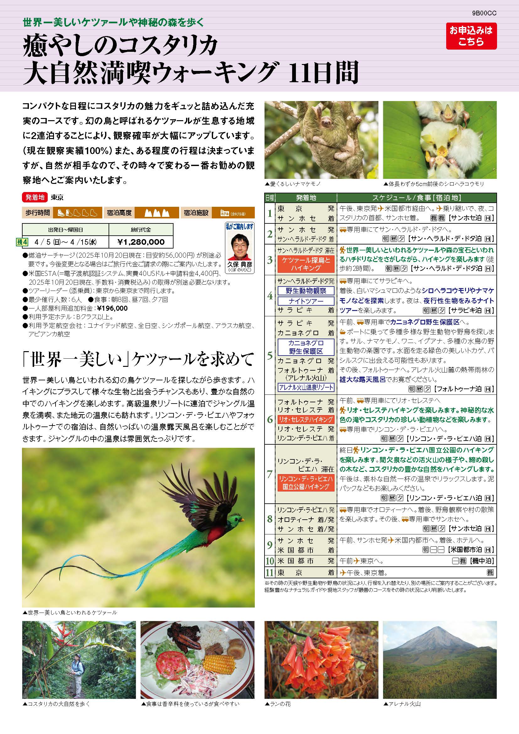 4月5日(日) 癒しのコスタリカ大自然満喫ウォーキング 11日間