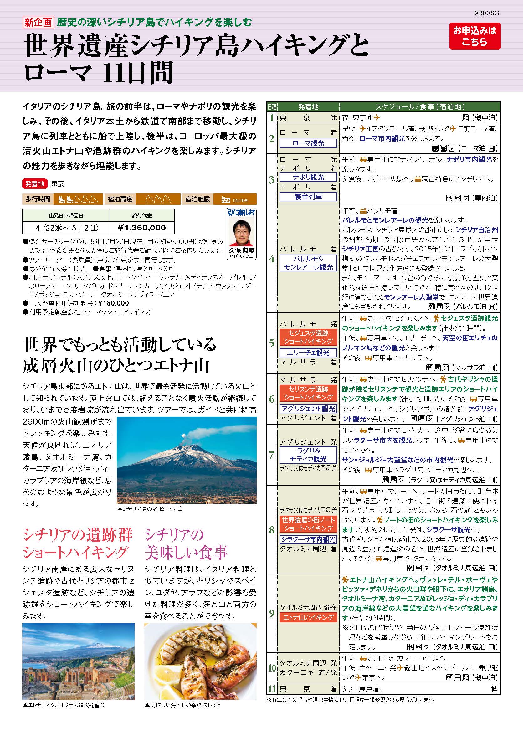 後半は、ヨーロッパ最大級の活火山エトナ山や遺跡群のハイキングを楽しみます。