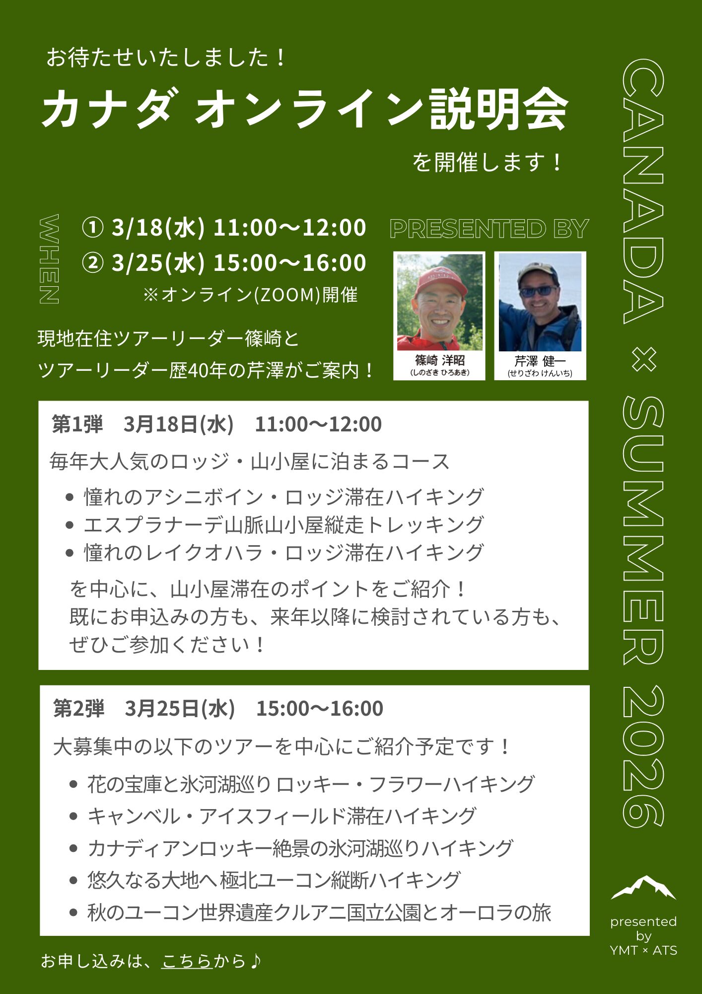 現地在住ツアーリーダー篠崎洋昭とツアーリーダー歴40年の芹澤健一がご紹介いたします。まだお申込みが間に合うコースを中心にご紹介しますので、ご検討中の方はぜひご参加ください。お花好きの方におすすめ「フラワーハイキング」、毎年人気のユーコン滞在、新コース「キャンベルアイスフィールド滞在ハイキング」や「絶景の氷河湖巡りハイキング」もご紹介いたします!