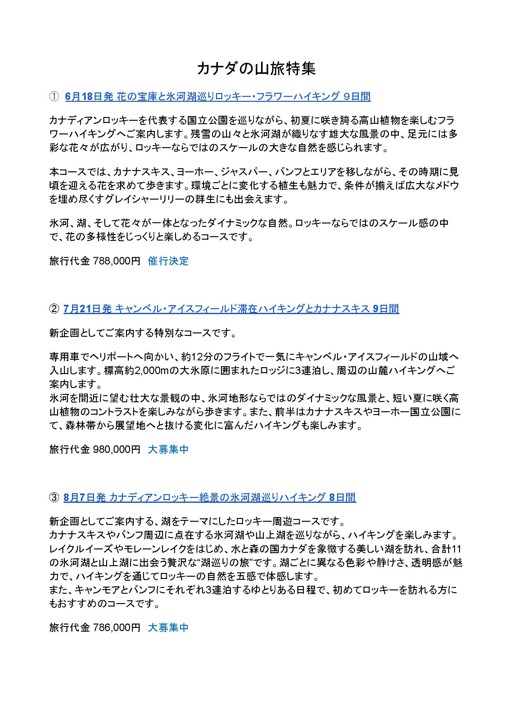 カナダの大自然を舞台にしたハイキングコースを特集してご紹介いたします。花の宝庫といわれるロッキーのフラワーハイキングをはじめ、氷河の奥地に滞在する新企画や、美しい湖を巡るコースなど、それぞれに異なる魅力を持つプログラムを揃えました。